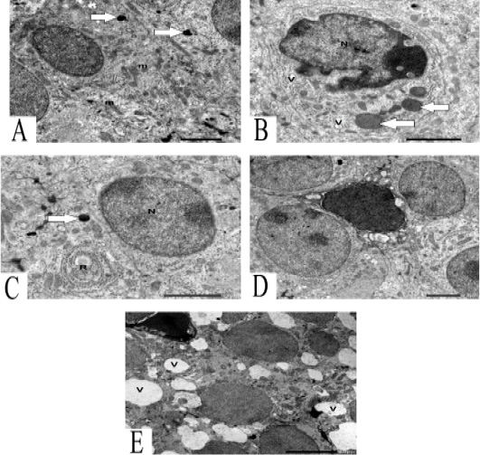 A: TEM of chief cells contains round and oval mitochondria (m) and lysosome (arrows) 2 μm. B: TEM of chief cells contain undulating nucleus (N) with condensation of chromatin, large secretory granules (arrows) and some vacuoles (V) 2 μm. C: TEM of chief cells contains nucleus (N) with chromatin islands, secretory granules (arrow) and characteristic RER (R) 2 μm. D: TEM of vacuolated chief cells between granulated chief cells. 2μm. E: TEM of vacuolated chief cells with dark nucleus and several vacuoles (V) .5 μm.
