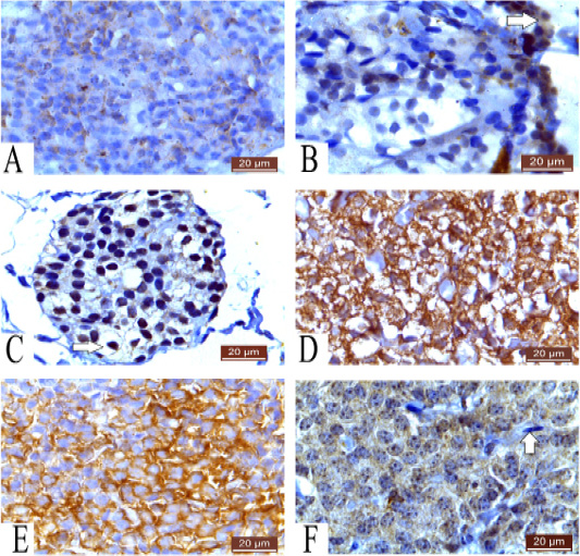 A: Photomicrograph of parathyroid gland of 60 ED showing very weak cytoplasmic reaction Caspase 3 (20µm). B: Photomicrograph of parathyroid gland of 60 ED Guinea pig showing negative cytoplasmic reaction of most of cells and positive cytoplasmic reaction of some cells (arrow) Bax (20µm). C: Photomicrograph of parathyroid gland of 1 month Guinea pig showing positive reaction and negative cytoplasmic reaction (arrow) Bax (20µm). D: Photomicrograph of parathyroid gland of 1 month showing positive cytoplasmic reaction of cells Caspase3 (20µm). E: Photomicrograph of parathyroid gland of 12 months showing strong cytoplasmic reaction of most of cells Caspase 3 (20µm). F: Photomicrograph of parathyroid gland of 12 months Guinea pig showing positive cytoplasmic reaction and negative fibroblast (arrow) Bax (20µm).