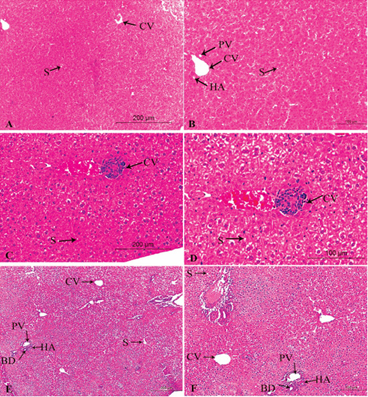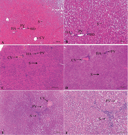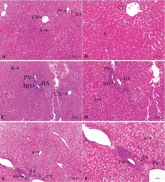 A photomicrograph of the neonatal liver at PND 14 showing the normal liver tissue in Group A (A, X100; B, X400) and the pathological effects of nicotine on the liver in Group B (C, X100; D, X400) and Group C (E, X100; F, X400). Central vein (CV), Portal vein(PV), Hepatic artery branch (HA), Bile duct (BD), Sinusoid (S).