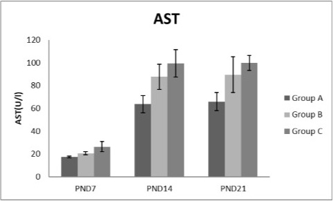 A photograph showing the effect of different nicotine doses on aspartate transaminase (AST) in blood serum of newborn at PND 7, 14 and 21. Group A (Control group), Group B (0.5 mg/kg nicotine) and Group C (1.5 mg/kg nicotine). Values were represented as Mean± SD; n=8 rats.