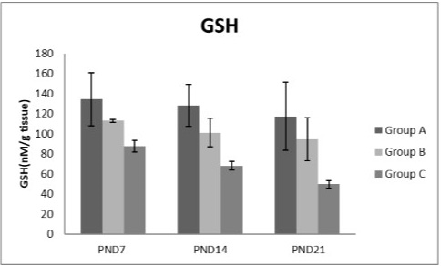A photograph showing the effect of different nicotine doses on GSH in liver tissue of newborn at PND 7, 14 and 21. Group A (Control group), Group B (0.5 mg/kg nicotine) and Group C (1.5 mg/kg nicotine). Values were represented as Mean± SD; n=8 rats.