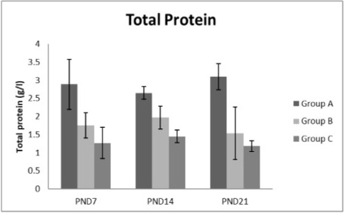 A photograph showing the effect of different nicotine doses on total protein in blood serum of newborn at PND 7, 14 and 21. Group A (Control group), Group B (0.5 mg/kg nicotine) and Group C (1.5 mg/kg nicotine). Values were represented as Mean± SD; n=8 rats.