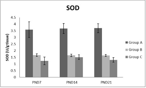 A photograph showing the effect of different nicotine doses on SOD in liver tissue of newborn at PND 7, 14 and 21. Group A (Control group), Group B (0.5 mg/kg nicotine) and Group C (1.5 mg/kg nicotine). Values were represented as Mean± SD; n=8 rats.
