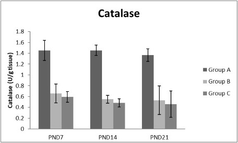 A photograph showing the effect of different nicotine doses on catalase in liver tissue of newborn at PND 7, 14 and 21. Group A (Control group), Group B (0.5 mg/kg nicotine) and Group C (1.5 mg/kg nicotine). Values were represented as Mean± SD; n=8 rats.