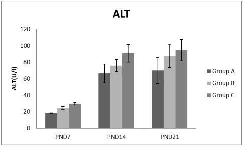 A photograph showing the effect of different nicotine doses on alanine transaminase (ALT) in blood serum of newborn at PND 7, 14 and 21. Group A (Control group), Group B (0.5 mg/kg nicotine) and Group C (1.5 mg/kg nicotine). Values were represented as Mean± SD, n=8 rats.
