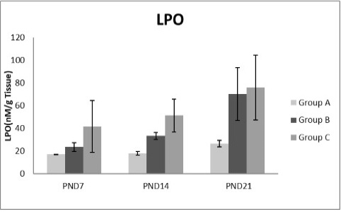 A photograph showing the effect of different nicotine doses on lipid peroxidase (LPO) in liver tissue of newborn at PND 7, 14 and 21. Group A (Control group), Group B (0.5 mg/kg nicotine) and Group C (1.5 mg/kg nicotine). Values were represented as Mean± SD; n=8 rats.