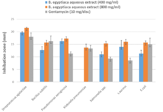 Antibacterial effect by different concentrations of B. aegyptiaca aqueous extract and Gentamycin antibiotic against bacteria isolated from clinical and subclinical mastitic cow’s milk.
