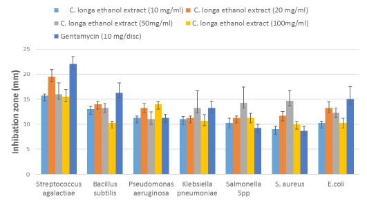 Antibacterial activity of the different concentrations of C. longa ethanol extract against bacteria strains isolated from clinical and subclinical mastitic cow’s milk compared with antibiotic.