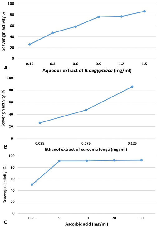 Antioxidant activity of different concentrations of aqueous extract of B. aegyptiaca (A); ethanol extract of Curcuma longa (B) and ascorbic acid (C) using DPPH method.