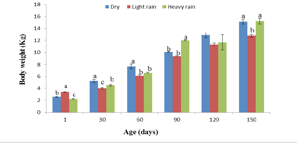 Body weights of kids from birth to 150 days of age as affected by the season of birth in Adilo district, south Ethiopia. Bars with different letters differ significantly at P value: non–significant, P>0.05 (at 120 days); P<0.001 (at birth); P<0.05(at 90 days); P<0.0001(at 30, 60 and 150 days)