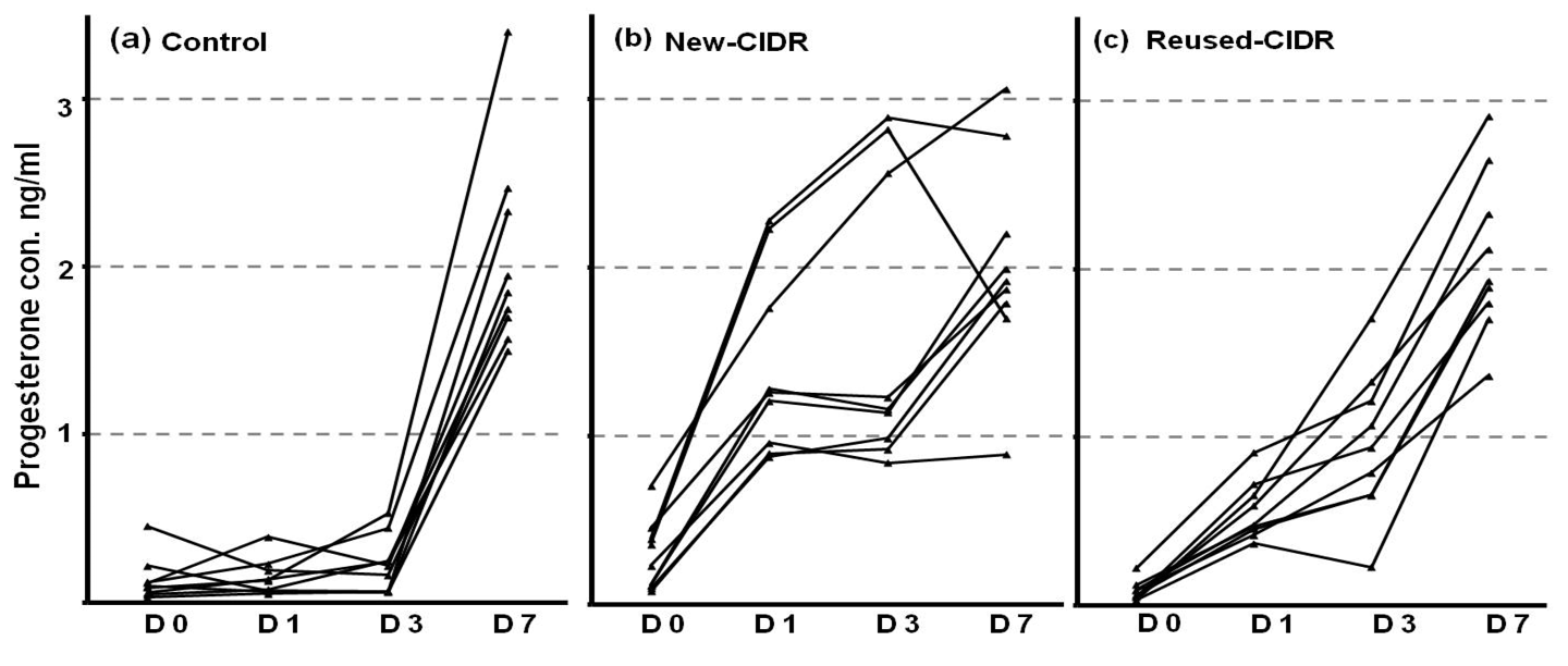 Serum progesterone concentration in individual cows in control group (a), cows received a new CIDR (b) or cows received previously used CIDR (c). The CIDR was inserted at day of estrus (day 0) and serum progesterone level was measured at day 0, 1, 3 and 7