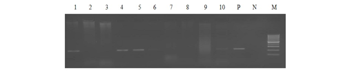 Lane 1-5: bovine serum DNA samples, Lane 6-10: bovine blood DNA samples, Lane P: positive control (B.abortus S99), Lane N: no template control and Lane M: 100bp ladder.