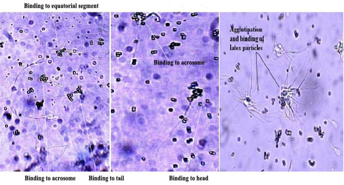 Showing binding of IgG/ IgA latex particles to spermatozoa in the presence of cervical mucus of a repeat breeding cow