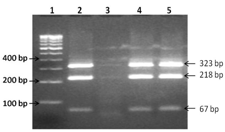 Lane 1: 100bp DNA ladder, lane 2: Positive control (MAP Indian Bison type DNA), lane 3: Negative control (miliQ water), lane 4-5: Digested DNA sample.