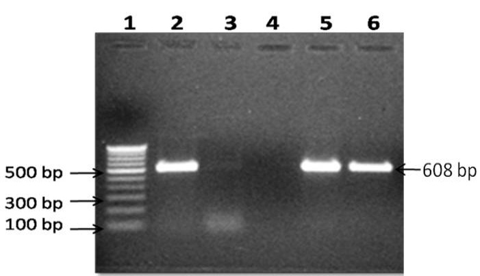Lane 1: 100 bp DNA ladder, Lane 2: Positive control (MAP DNA), Lane 4: Negative control (miliQ water) and Lane 5-6: DNA samples positive in IS900 PCR