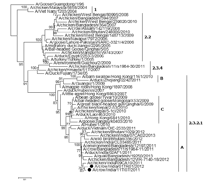 Phylogenetic relationship of HA sequences of H5N1 viruses isolated from crows in India. Bootstrap values (≥70%) are shown near the nodes. Major clades are shown to the right. The isolates sequenced in this study are marked with solid circle. The tree is rooted to A/Goose/Guangdong/1/96.