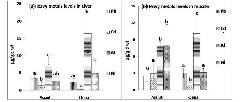 Mean concentration of heavy metals Pb, Cd, Al and Ni expressed as µg/g d wt in (a) liver samples and (b) muscle samples from Assiut and Qena broiler farms.