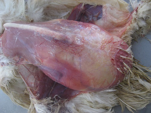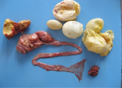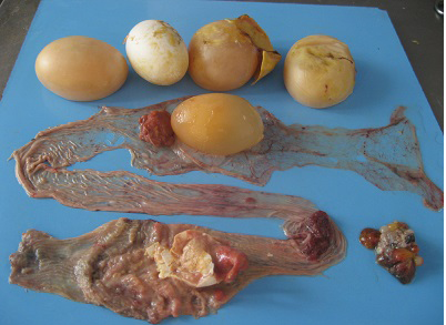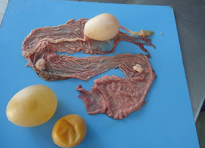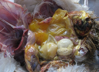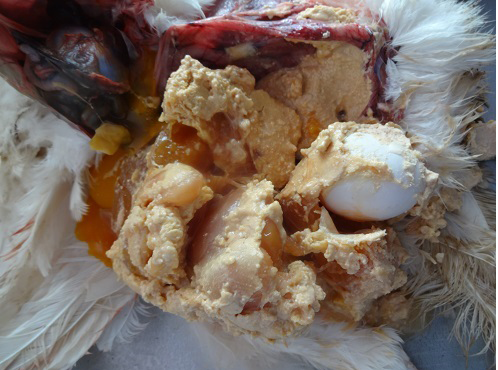 Abdominal cavity showing coagulated yolk deposits and eggs.