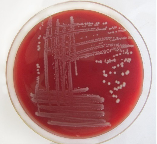 Klebsiella pneumoniae showing non-hemolytic grey-white, mucoid colonies on sheep blood agar