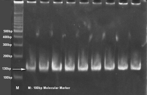 Klebsiella pneumonaie isolates showing typical 130bp size product with specific primers on 8% polyacrylamide gel