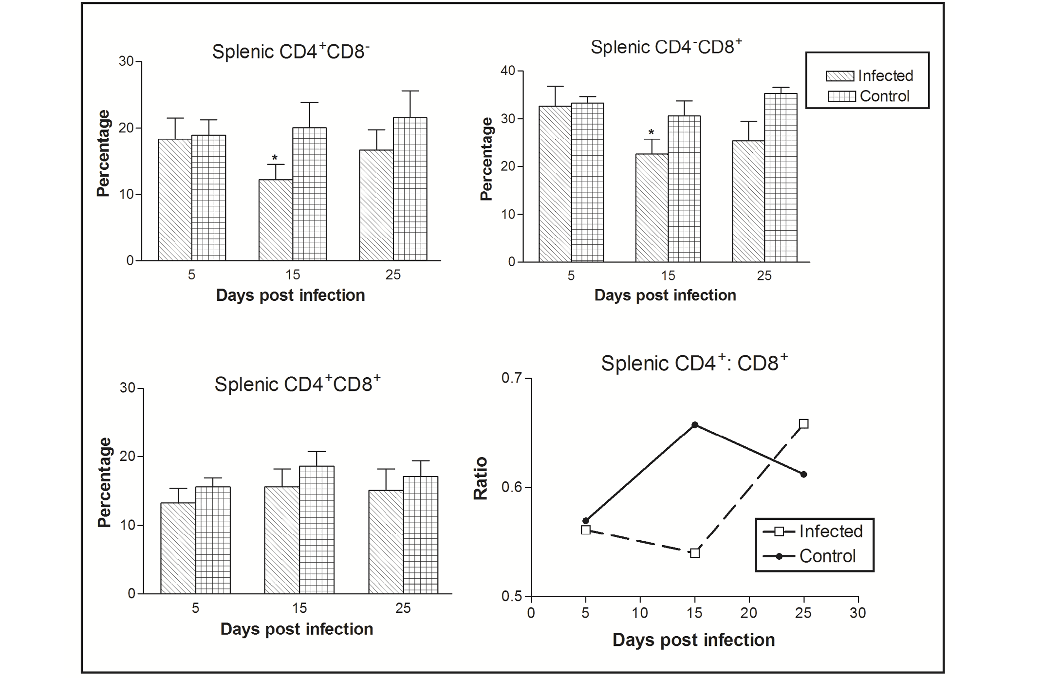 Effect of CIAV infection on splenic T lymphocytes in 6-week-old infected chicks at various post infection days. Values are represented as Mean ± SD, * p <0.05