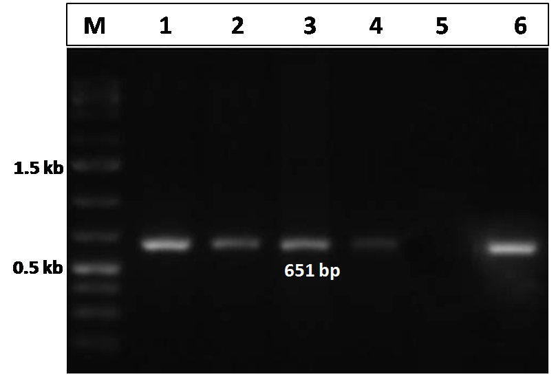 Lane1, 2, 3, 4: tissues samples from chicks of CIAV infected group; Lane 5: Negative control; Lane 6: CIAV positive control; Lane M: 1Kb DNA ladder.