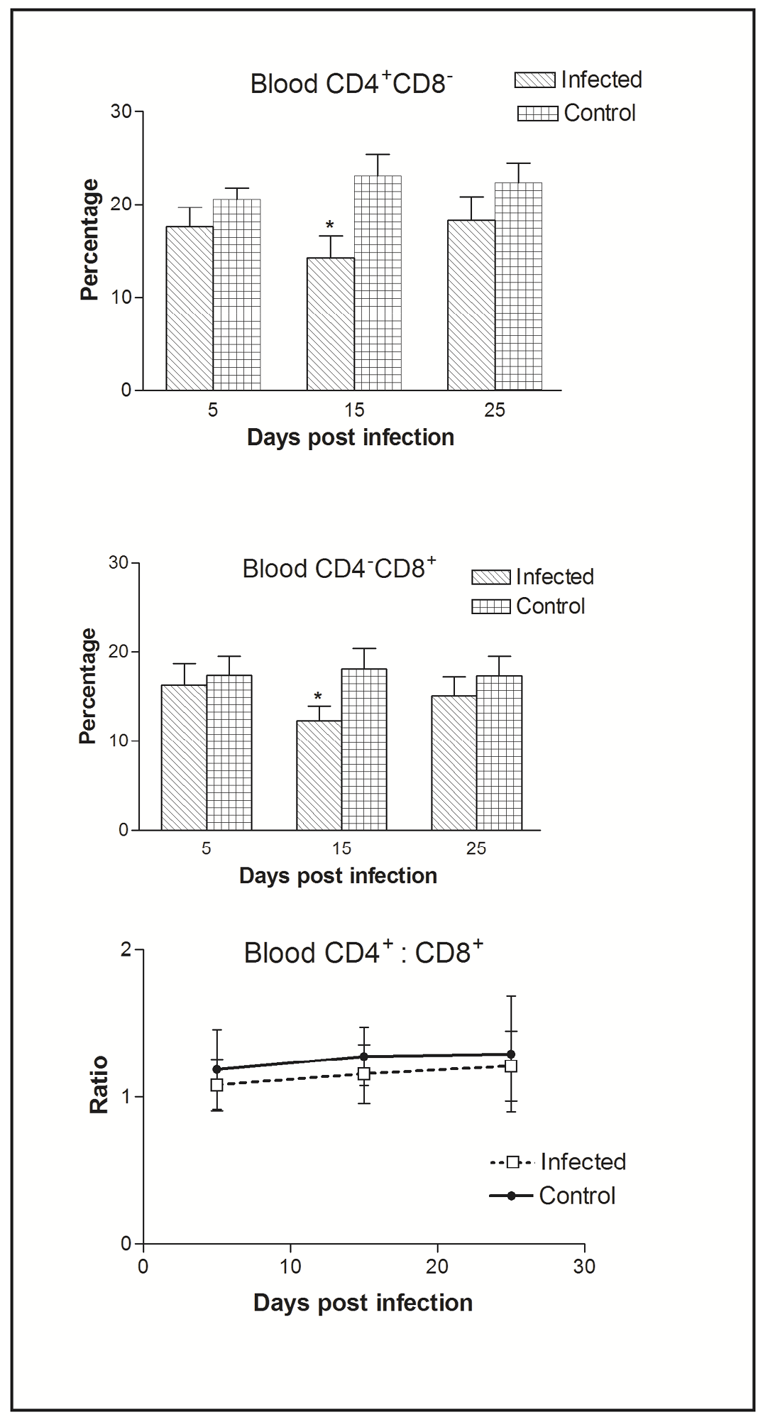Effect of CIAV infection on T lymphocytes in blood at various post infection days. Values are represented as Mean ± SD, * p <0.05.