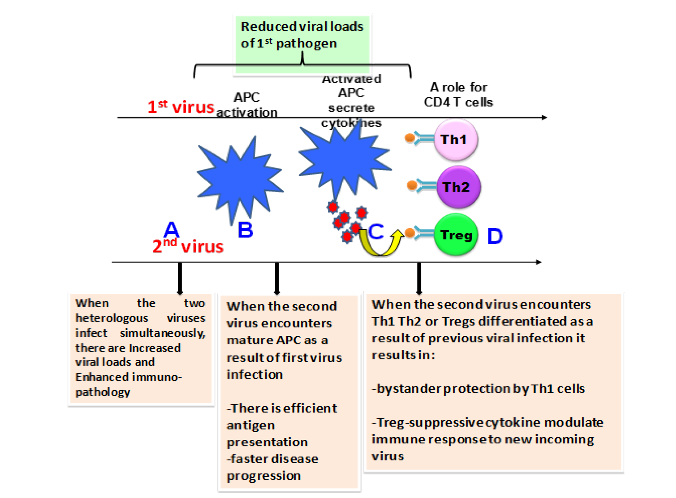 (B) Prior infection can result in activation of APC and the new incoming infection at this stage encounters mature APC, efficient antigen presentation and faster disease progression. Also the new incoming pathogen creates a strong antiviral state that might result in reduced viral loads of first pathogen.