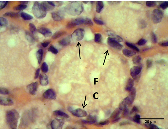 Sections of thyroid gland in Kit from group (B), showing cuboidal thyrocytes (arrows) and the follicular colloid (FC) that filled the follicular lumen had foamy appearance. H & E stain