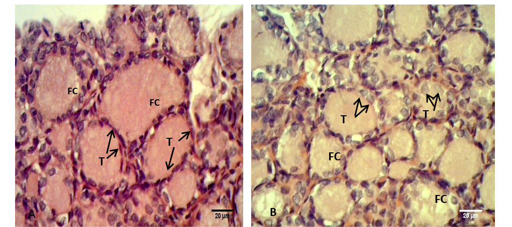 Sections of thyroid gland in Kit; (A) Control group, showing flattened to cuboidal thyrocytes (T) with homogenous cytoplasm and the follicular colloid (FC) filled the follicular lumen; (B) group their mother’s eating mixed feed with cruciferous vegetable, showing cuboidal thyrocytes (T) and the follicular colloid (FC) had foamy appearance. H & E stain.