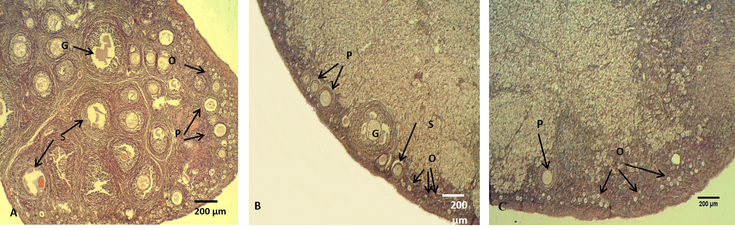 The ovary of adult rabbit; (A) Control group, showing high ovarian activity; (B) group eating mixed feed with cruciferous vegetable, showing low in ovarian activity; (C) group eating only cruciferous vegetable, showing lower ovarian activity. Where (O) Oocytes (P) Primary ovarian follicle, (S) Secondary ovarian follicles, (G) Mature ovarian follicles. H & E stain
