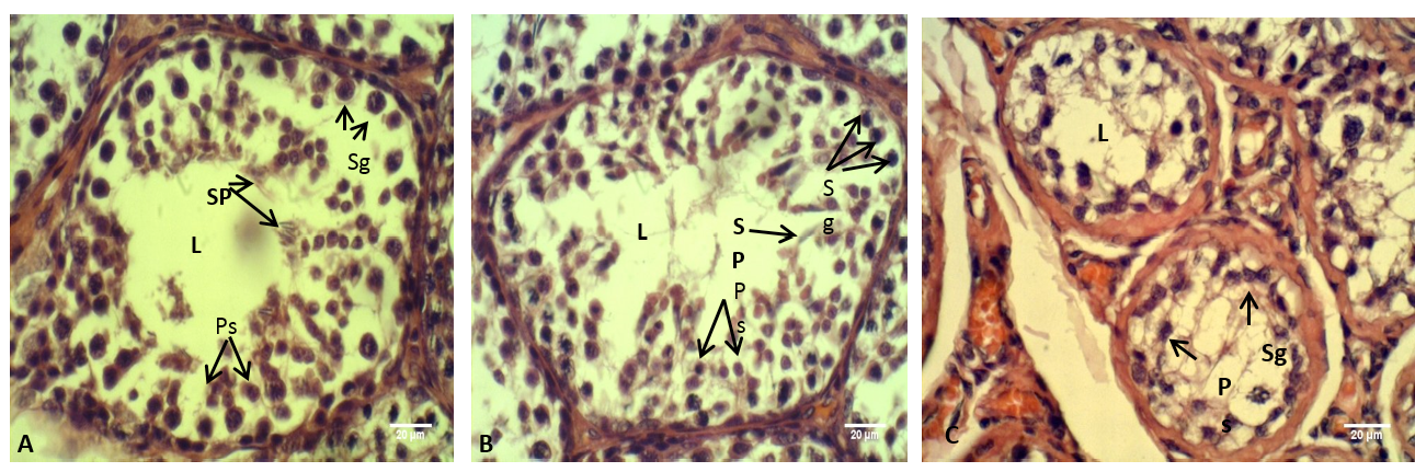 The testis of adult rabbit; (A) Control group, showing the epithelium of the seminiferous tubules with various stages of spermatogenesis; (B) group eating mixed feed with cruciferous vegetable, showing not typical arrangement of the spermatogenic cells; (C) group eating only cruciferous vegetable, showing spermatogenic cells were clustered together. Where (L) Lumen of seminiferous tubules (Sp) Spermatid, (Ps) Primary spermatozoa, (Sg) Spermatogonia. H & E stain