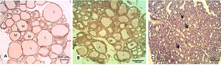 Sections of thyroid gland in adult, (A) Control group; (B) group eating mixed feed with cruciferous vegetable; (C) group eating only cruciferous vegetable. Showing the thyroid follicles in different size, (L) Large size, (M) Medium size, (S) Small size. H & E stain