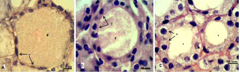 Sections of thyroid gland in adult; (A) Control group, showing flattened thyrocytes (T) with homogenous cytoplasm and the follicular colloid (FC) filled the follicular lumen; (B) group eating mixed feed with cruciferous vegetable, showing cuboidal thyrocytes (T) and the follicular colloid (FC) partially filled the follicular lumen; (C) group eating only cruciferous vegetable, showing cuboidal to columnar thyrocytes (T) with vacuolated cytoplasm and the follicular lumen (L) empty from colloid. H & E stain.
