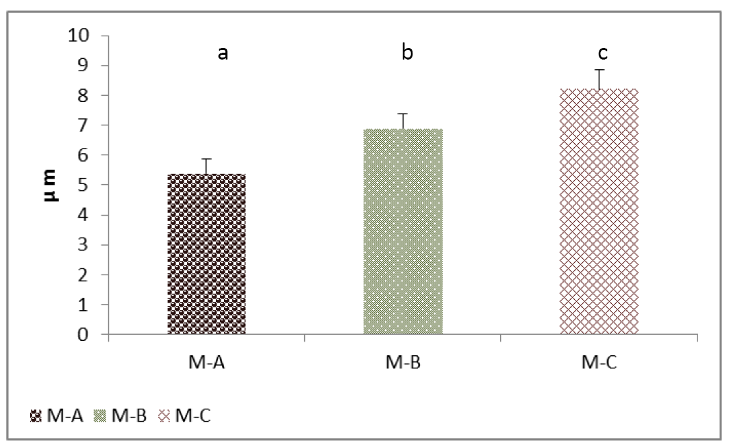 Cell height (Thyrocytes) of thyroid gland of the mature rabbit. Where the (M.A) control group, (M.B) group eating mixed feed with cruciferous vegetable, (M.C) group eating only cruciferous vegetable. Values are means ± SD, N= 8. Different superscript letter indicating significant (P<0.05) differences.
