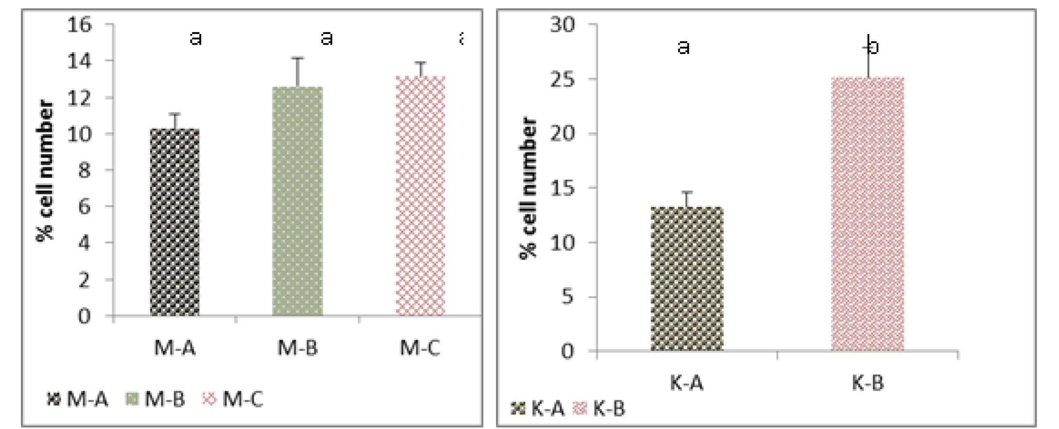 Cell number (Thyrocytes) of thyroid gland of the mature rabbit (Left) and their kit (Right). Where the (M.A) mature control group, (M.B) mature group eating mixed feed with cruciferous vegetable, (M.C) mature group eating only cruciferous vegetable. (K.A) Kit from control group, (K.B) kit from group (B). Values are means ± SD, N= 8. Different superscript letter indicating significant (P<0.05) differences