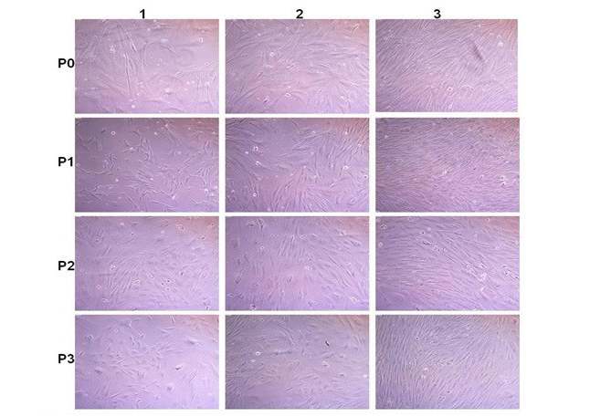 Rabbit fatal Osteoblast cell culture: P0; P1; P2 and P3 are passaged. 1; 2 and 3 images after 2; 6 and 8 days after passages. Cells become confluence (80-90% growth) within 6-8 days after passage