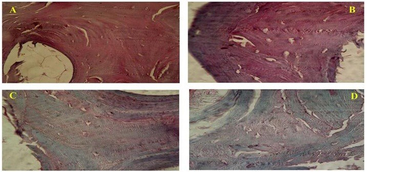 Photomicrograph showing (A-Native bone) intense GAG staining, (B-SDS treated bone) preserved GAG, (C-Acetone/Ethanol treated) less staining for GAG and (D-Freeze and Thawing group) less GAG content as compared to native bone. (Safranin-O; x40)
