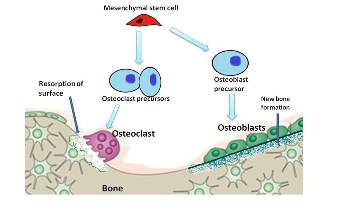Diagram is showing evolution of osteoblasts and osteoclasts in the formation and resorption of bone