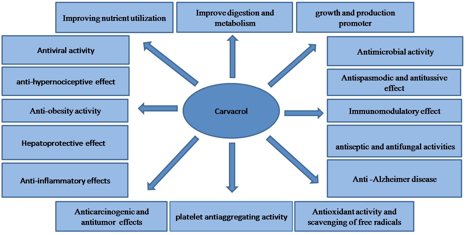 Modes of action and biological activities of carvacrol