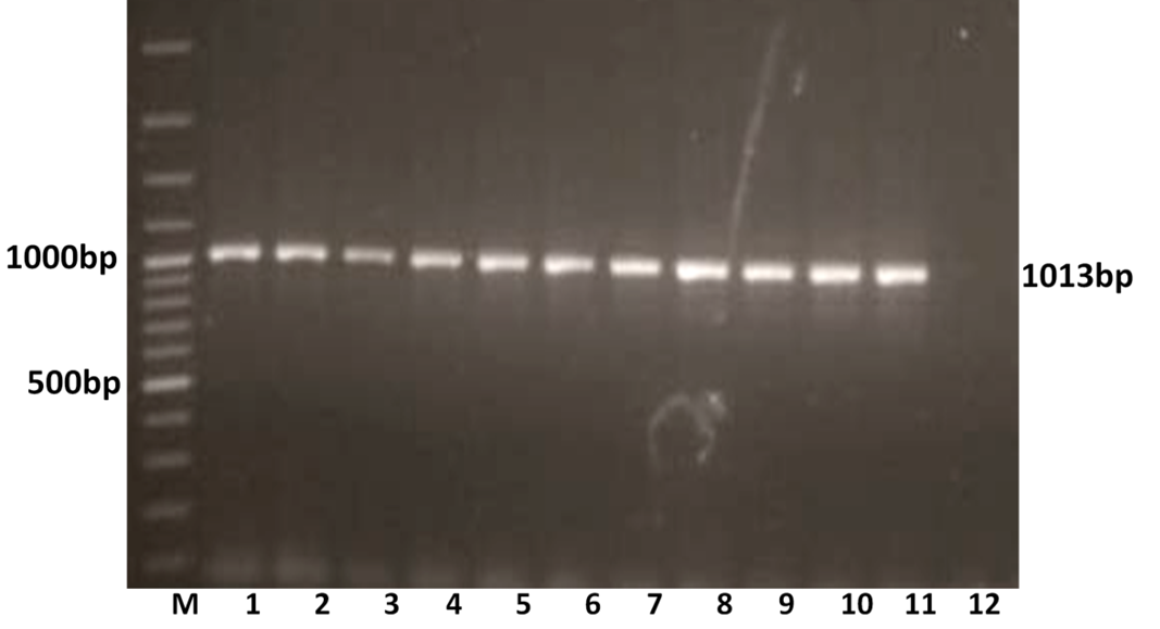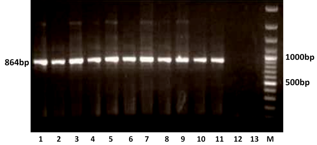 Lanes: M- 100 bp DNA Ladder, 1-11: BoRVA VP4 gene products, 12-13: no template control.