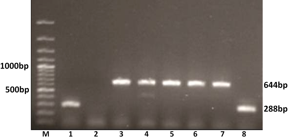 Lanes: M- 100 bp DNA Ladder; Lanes: 1 and 8 BoRVA G6 genotype specific products; 2: no template control; 3-7: BoRVA G10 genotype specific products.