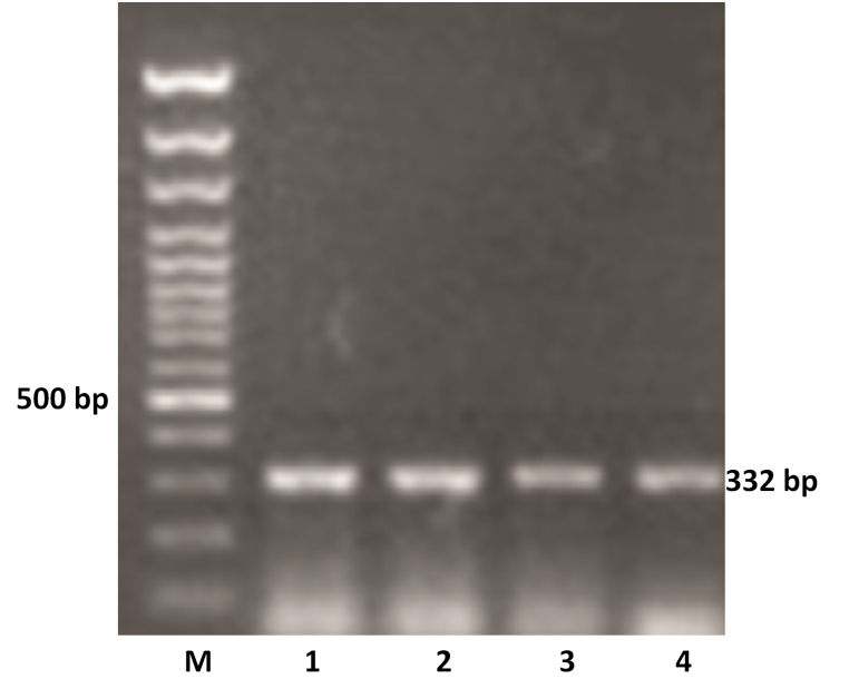 Lanes: M- 100 bp DNA Ladder, 1-4: BoRVA P[11] genotype specific PCR products.