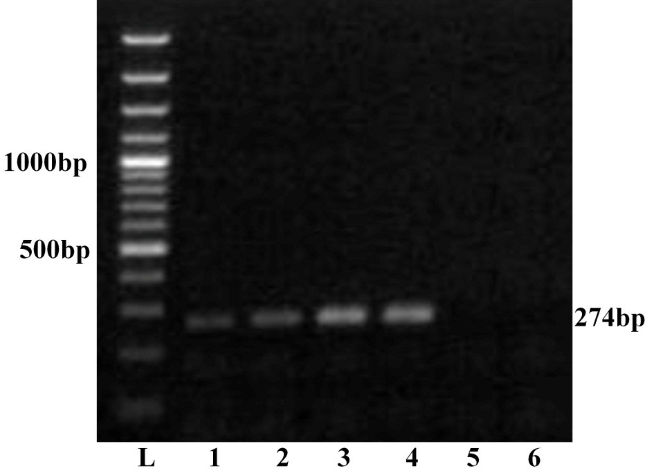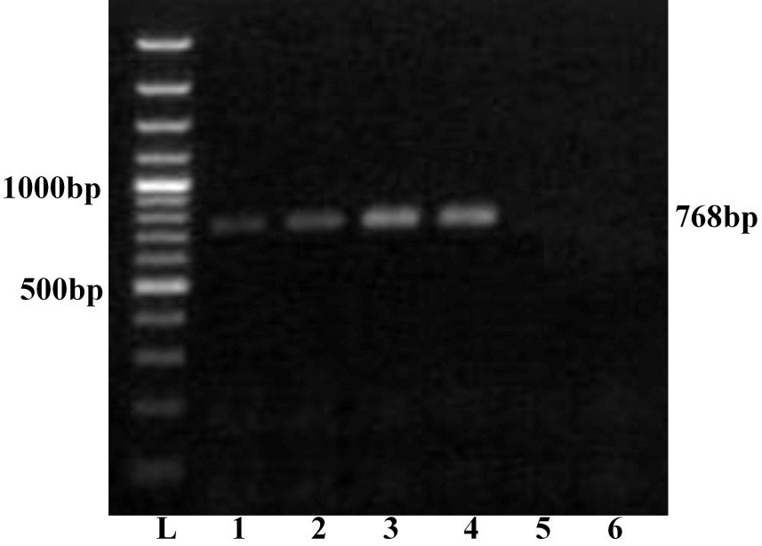 Lane L: Ladder 100bp; 1: GNT27/IND; 2: MBN48/IND; 3: MBN50/IND; 4: VJW66/IND; 5: BHK21 cell control; 6: Nuclese free water control. The left side numbers indicate DNA marker and right side indicated size of PCR product.