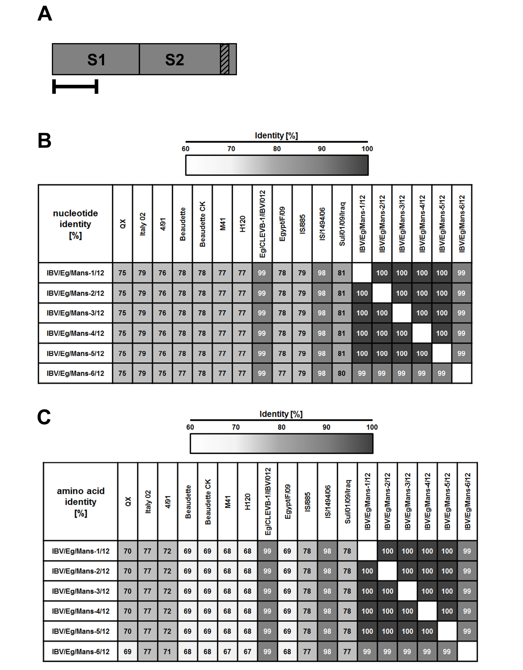 By RT-PCR, partial S-protein sequences (A) were determined and used to calculate the total sequence identity on nucleotide (B) and amino acid level (C) for the Egyptian IBV isolates to selected reference strains . Numbers indicate the total sequence identity (in %).