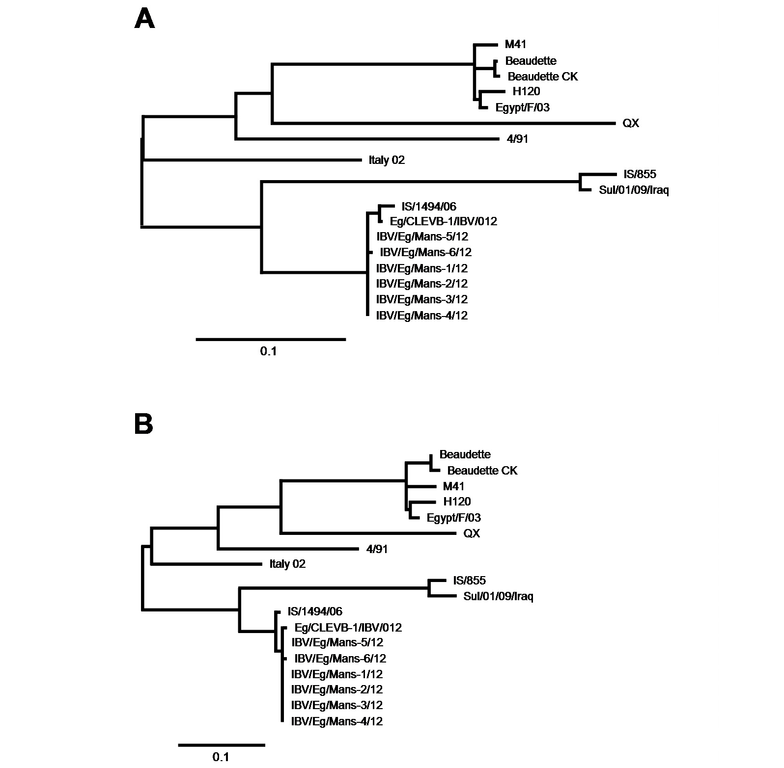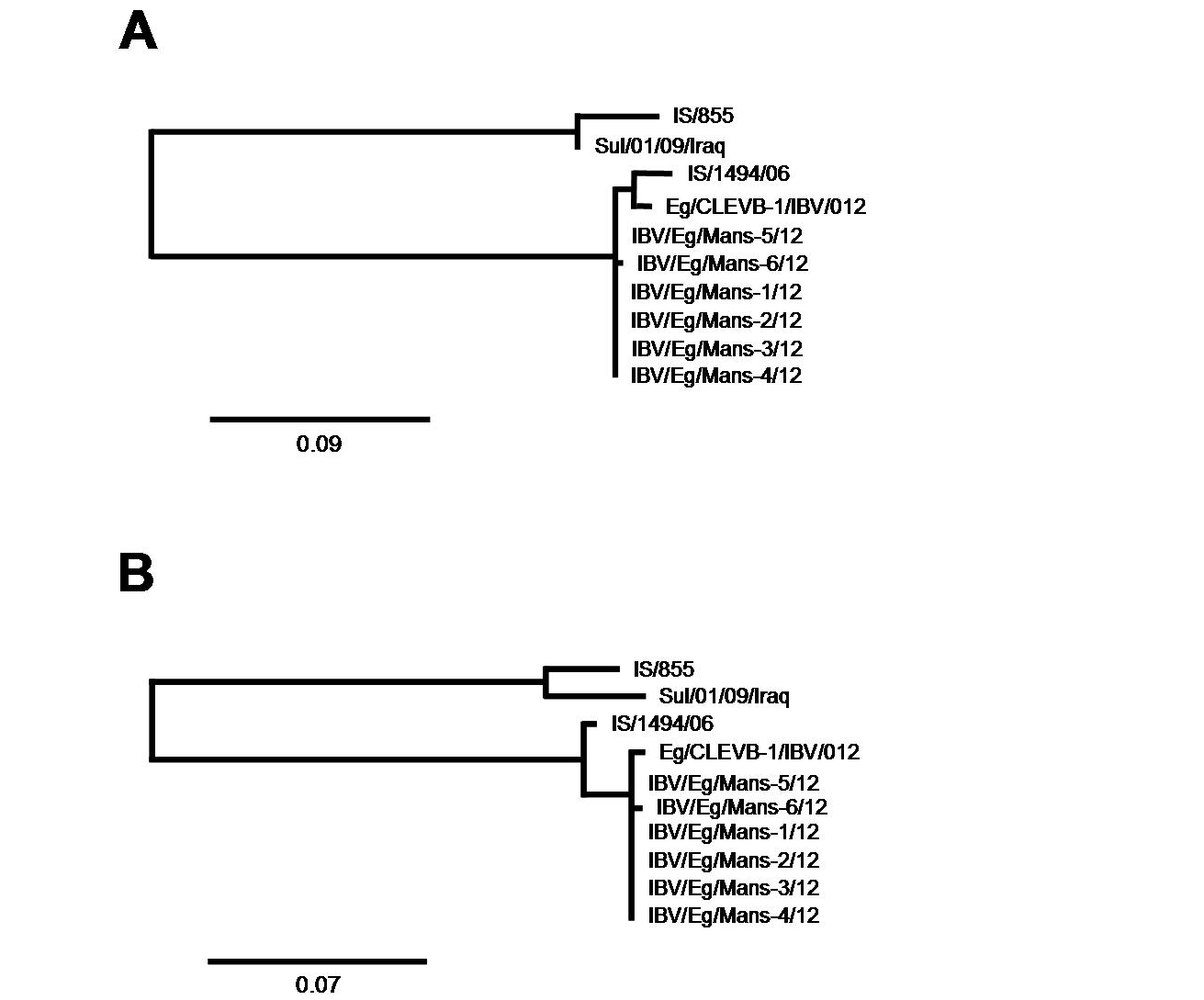 The partial S-protein sequences on nucleotide (A) and amino acid level (B) of the Egyptian IBV isolates. Scale bars indicate the number of nucleotide /amino acid substitutions per site.