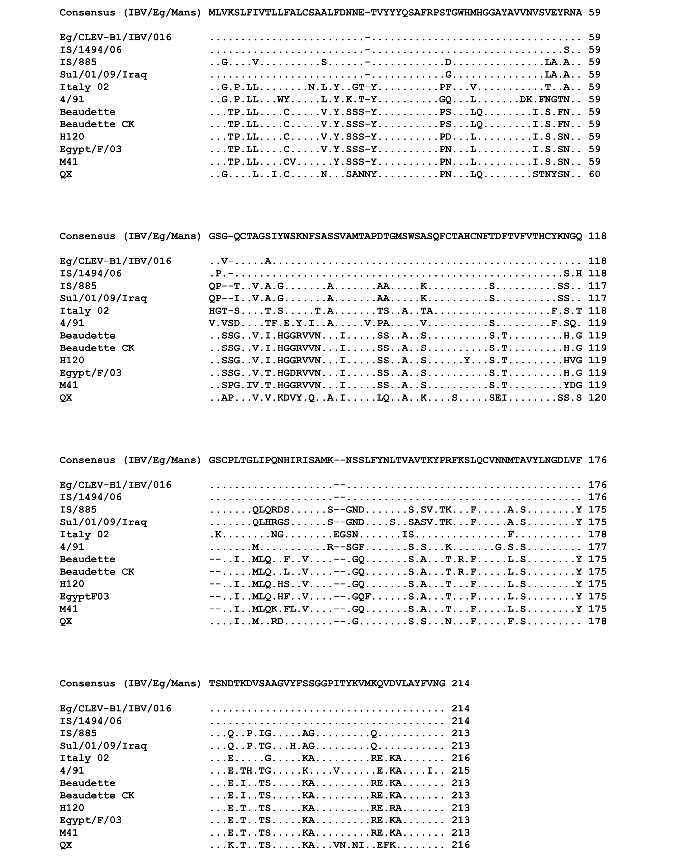 Points indicate amino acid residues that are identical to the consensus sequence, while different amino acid residues are indicated by letters. Gaps which are a result of the alignment are indicated by a minus.