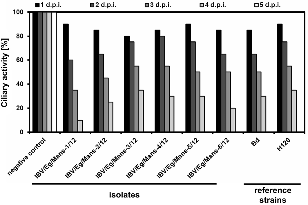 Chicken TOCs inoculated by 1x104 ffu/ml of the IBV isolates (IBV/Eg/Mans-1, -2, -3, -4, -5, or -6/12) and the reference strains (Beaudette and H120); Mock-treated TOCs served as a negative control