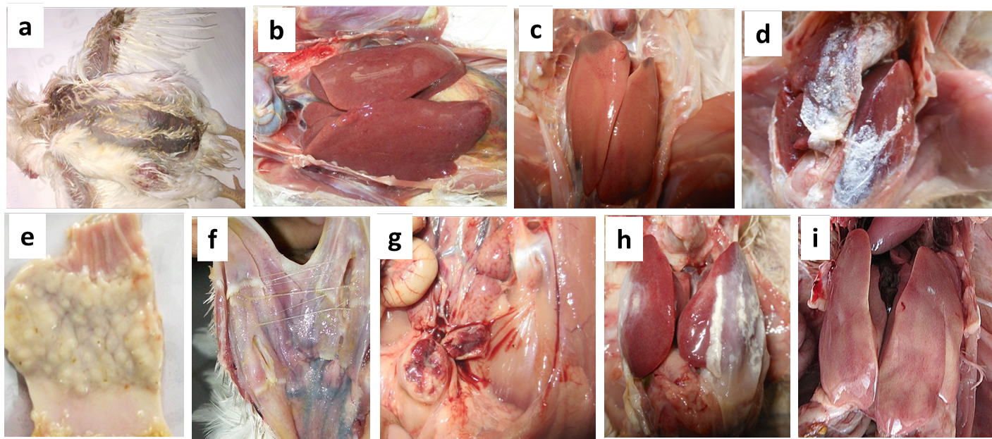 (c) Swollen liver with necrotic foci in CIA-GDS affected bird;