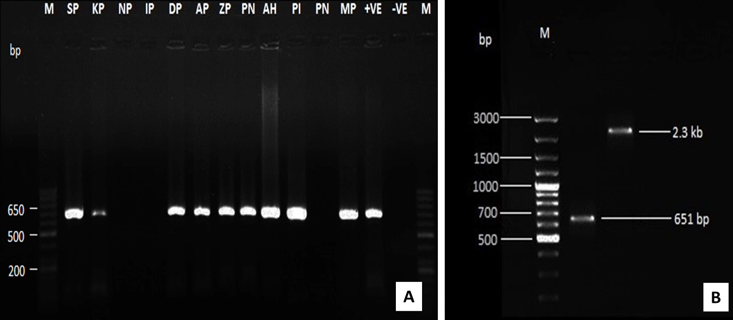 Amplification of CAV-DNA using PCR assay using VP2 specific primer (A) and by using both VP2 and full length genome primers (B)